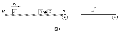 24.(19分)图11所示为研究某种弹射装置的示意图,光滑的水平导轨MN右端N处与水平传送带理想连接,传送带足够长,皮带轮沿逆时针方向转动,带动皮带以恒定速度v= 2.0 m/s匀速传动。三个质量均为m=1.0 kg的滑块A、B、C置于水平导轨上,开始时在B、C间有一压缩的轻弹簧,两滑块用细绳相连处于静止状态。滑块A以初速度v0=4.0 m/s沿B、C连线方向向B运动,A与B碰撞后粘合在一起,碰撞时间极短,可认为A与B碰撞过程中滑块C的速度仍为零。因碰撞使连接B、C的细绳受扰动而突然断开,弹簧伸展,从而使C与A、B分离。滑块C脱离弹簧后以速度vC=4.0 m/s滑上传送带。已知滑块C与传送带间的动摩擦因数m=0.20,重力加速度g取10 m/s2。