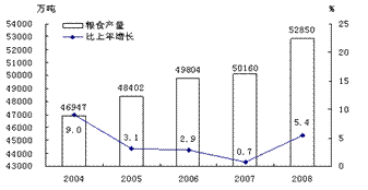 右图为“2004-2008年我国粮食产量及其增长速度”图。近年来,引起我国粮食产量发生变化的主要影响因素是: