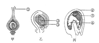 (2)乙图中的__________________________(填图中序号)受精后将发育成丙图中的⑤,⑤发育所需的营养物质是由__________________________(填图中序号)提供的;种子萌发早期所需的营养物质来自__________________________(填种子结构名称)。