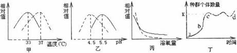 5.某种生产香料添加剂的发酵工程细菌,其生长速率、代谢产物的产量与培养液中的温度pH、溶氧量等关系如下图甲、乙、丙三条曲线所示(其中实线表示生长速率,虚线表示产物产量),丁曲线表示某种生物种群数量随时间变化曲线。据图分析下列有关叙述正确的是