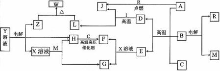 27.(15分)下图涉及多个无机化工反应,其中E是由两种元素组成的一种新型无机材料,M、L是两种应用广泛的金属,A、C、R、H、Z都是由短周期元素组成的单质,G的焰色反应呈黄色,向G溶液中通入J气体时可得到一种白色胶状沉淀,将该白色胶状沉淀滤出洗净后加热分解可以得到B,J是直线型分子,其分子内共有22个电子,I是红棕色.粉末。