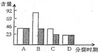 3. 右图是人体一个细胞分裂时,细胞核中染色体数(有阴影)和DNA分子数(无阴影)在A、B、C、D四个时期的统计数据。则同源染色体彻底分开发生在: