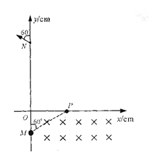5×103V/m,Bl大小为0。5T;第一象限的某个矩形区域内,有方向垂直纸面的匀强磁场B2,磁场的下边界与x轴重合.一质量m=1×10-14kg、电荷量q=2×l0-10C的带正电微粒以某一速度v沿与y轴正方向60°角从M点沿直线运动,经P点即进入处于第一象限内的磁场B2区域.一段时间后,小球经过y轴上的N点并与y轴正方向成60°角的方向飞出。M点的坐标为(0,-10),N点的坐标为(0,30),不计粒子重力,g取10m/s2.则求: