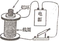 绕有线圈的铁芯直立在水平桌面上,铁芯上套着一个轻铝环,线圈与电源、电键相连,如图所示.按下电键,并一直保持闭合,则