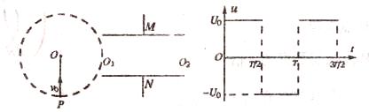 25.(18分)如图所示,在真空中,半径为足的虚线所围的圆形区域内存在匀强磁场,磁场方向垂直纸面外.在磁场右侧有一对平行金属板M和N,两板间距离也为R,板长为2R。两板的中心线的延长线过磁场区域的圆心O,并与磁场边界相交于O1,两板左端与0l在同-直线上.有一电荷量为q、质量为m的带正电的粒子,以速率vo从圆周上的P点沿垂直于半径OO1。并指向圆心O的方向进入磁场,当从圆周上的O1点飞出磁场时,给M、N加上如下图所示电压u.最后粒子恰好从N板的边缘平行于N板飞出.不计平行金属板两端的边缘效应及粒子所受的重力.