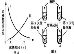 香蕉果实成熟过程中,果实中的贮藏物不断代谢转化,香蕉逐渐变甜。右图A中I、Ⅱ两条曲线分别表示香蕉果实成熟过程中两种物质含量的变化趋势。取成熟到第X天和第Y天的等量香蕉果肉,分别加等量的蒸馏水制成提取液。然后在a、b试管中各加5 mL第X天的提取液,在c、d试管中各加5 mL第Y天的提取液,如右图B。