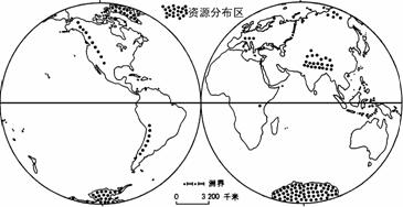 自然资源是人类生存和发展的物质条件。下图中黑点所在地是世界某种资源的主要分布区,读图回答74-75题。