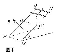 如下图甲所示,两根质量均为 0.1 kg完全相同的导体棒a、b,用绝缘轻杆相连置于由金属导轨PQ、MN架设的斜面上。已知斜面倾角θ为53°,a、b导体棒的间距是PQ、MN导轨间间距的一半,导轨间分界线OO′ 以下有方向垂直斜面向上的匀强磁场。当 a、b导体棒沿导轨下滑时,其下滑速度v与时间的关系图像如图乙所示。若a、b导 体棒接入电路的电阻均为1Ω,其它电阻不计,取g = 10 m/s2,sin53°≈0.8,cos53°≈0.6,试求: