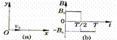 如下图(a)所示,在坐标xoy平面的第一象限内,有一个匀强磁场,磁感应强度大小恒为B0,方向垂直于xoy平面,且随时间做周期性变化,如图(b)所示,规定垂直xoy平面向里的磁场方向为正.一个质量为m,电量为q的正粒子,在t=0时刻从坐标原点以初速度vo沿x轴正方向射入,在匀强磁场中运动,经过一个磁场变化周期T(未确定)的时间,粒子到达第一象限内的某一点P,且速度方向沿x轴正方向(不考虑重力作用)。
