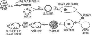 2008年诺贝尔化学奖授予了三位在研究绿色荧光蛋白(GFP)方面做出突出贡献的科学家。绿色荧光蛋白能在蓝光或紫外光的激发下发出荧光,这样借助GFP发出的荧光 就可以跟踪蛋白质在细胞内部的移动情况,帮助推断蛋白质的功能。下图为我国首例绿色荧光蛋白(GFP)转基因克隆猪的培育过程示意图,据图回答: