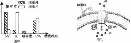 2.图甲表示四种不同的物质在一个动物细胞内外的相对浓度差异。其中通过图乙所示的过程来维持细胞内外浓度差异的物质是