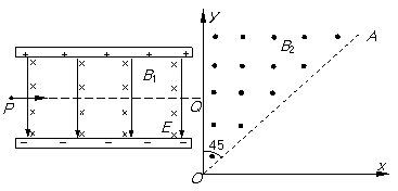 25.(20分)如图所示的平行板器件中,存在相互垂直的匀强磁场和匀强电场,磁场的磁感应强度B1=0.40T,方向垂直纸面向里,电场强度E=2.0×105V/m,PQ为板间中线.紧靠平行板右侧边缘xOy坐标系的第一象限内,有垂直纸面向外的匀强磁场,磁感应强度B2=0.25T,磁场边界AO和y轴的夹角∠AOy=45°.一束带电量q=8.0×10-19C的正离子从P点射入平行板间,沿中线PQ做直线运动,穿出平行板后从y轴上坐标为(0,0.2m)的Q点垂直y轴射入磁场区,离子通过x轴时的速度方向与x轴正方向夹角在45°~90°之间.则: