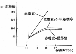 6.植物激素中的赤霉素能诱导α-淀粉酶的产生,而脱落酸加快植物衰老,对α-淀粉酶的合成起抑制作用,两者在α-淀粉酶的合成中的相互作用如下图,6-甲基嘌呤是mRNA合成的抑制剂,抑制剂在第11小时加入,见图中“↓”。请根据图中信息和相关知识分析,下列说法错误的是 ( )