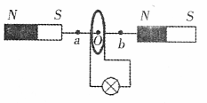 灯泡就会发光,其中O点是两磁极连线的中点,a、b两点是线圈运动经过的两点,且关于O点对称,则下列说法正确的是 ( )