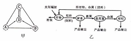 (2)人们经常施肥、浇灌、锄草、治虫,使能量尽可能多的流向图乙中的 。实现了物质和能量的多级利用,与此有关的生物是图乙中的 ,它们属于图甲中 (填字母)。