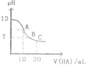 10.25 ℃时,在10 mL 0.1 mol/L NaOH溶液中逐滴加入0.1 mol/L 一元酸HA溶液,溶液的pH变化曲线如图所示。下列粒子浓度的关系中不正确的是