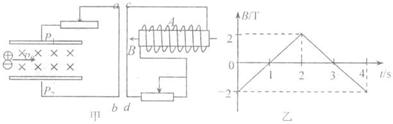 21.等离子气流由左方连续以v0射入P1和P2两板间的匀强磁场中,ab直导线与P1、P2相连接,线圈A与直导线cd连接.线圈A内有随图乙所示的变化磁场.且磁场B的正方向规定为向左,如图甲所示,则下列叙述正确的是