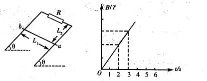 25.(18分)两根平行的金属导轨相距L1=1m,与水平成θ=30°角倾斜放置如图,其上端连接阻值R=1.5Ω的电阻,另有一根质量m=0.2kg,阻值r=0.5Ω的金属棒ab放在两导轨上,距离上端L2=4m棒与导轨垂直并良好接触,导轨电阻不计,因而摩擦力作用,金属棒处于静止状态,现在垂直导轨面方向向上从零均匀增强的磁场,磁感应强度的变化规律如图,已知在t=2时棒与导轨间的摩擦力刚好为零(g取10m/s2)。则在棒发生滑动之前。