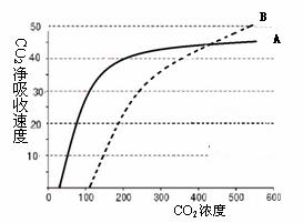 下图表示在适宜温度、水分和一定的光照强度下,两种植物的叶片在不同CO2浓度下CO2净吸收速度,下列叙述正确的是( )