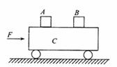 (18分)如图所示,质量分别为mA=0.4kg和mB=0.6kg的可视为质点的A、B两物体,放在质量为mC=1kg的足够长的小车C上。A、B相距L=12.5cm,它们随车以v0=1.0m/s的速度在光滑的水平面上向右匀速运动。若在小车上加一水平向右的推力F=3.8N,A、B便在小车上滑动.已知A、B与小车间的动摩擦因数分别为μA=0.2,μB=0.1,