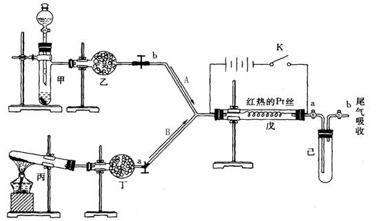⑸当已中充满红棕色气体后,停止给丙加热,并关闭a,b活塞。取下已装置并浸入冰水中,则已中会出现的现象是 ,简述产生此现象的原因 。