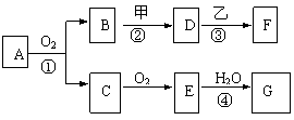 (14分)物质的转化关系如下图所示,其中甲可由两种单质直接化合得到,乙为金属单质,F的溶液中只含一种溶质,G为酸,乙在G的浓溶液中发生钝化。若用两根玻璃棒分别蘸取A、G的浓溶液并使它们接近,有大量白烟生成;甲为一种淡黄色固体,D、F的溶液均呈碱性。则