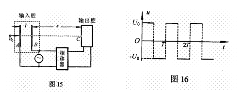时刻经B板射出的速度为v2的电子同时进入输出腔,则可通过相移器的控制将电子的动能转化为输出腔中的电场能,从而实现对甚高频信号进行放大的作用。为实现上述过程,输出腔的C孔到输入腔的右极板B的距离s应满足什么条件?