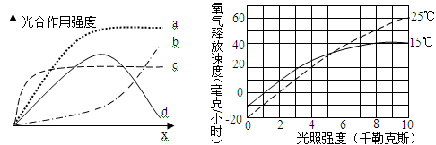 ⑴如果x代表光照强度,光照强度影响光合作用强度,主要是影响 阶段,当光合作用强度达到最大值时,此时限制因素最可能是内部因素中的 。
