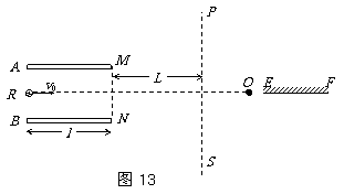 25.(15分)如图13所示,两平行金属板A、B长l=8cm,两板间距离d=8cm,A板比B板电势高300V,即UAB=300V。一带正电的粒子电量q=10-10C,质量m=10-20kg,从R点沿电场中心线垂直电场线飞入电场,初速度v0=2×106m/s,粒子飞出平行板电场后经过界面MN、PS间的无电场区域后,进入固定在中心线上的O点的点电荷Q形成的电场区域(设界面PS右边点电荷的电场分布不受界面的影响)。已知两界面MN、PS相距为L=12cm,粒子穿过界面PS最后垂直打在放置于中心线上的荧光屏EF上。求(静电力常数k=9×109N·m2/C2)