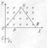 OMN是一绝缘弹性材料制成的等边三角形框架,边长L为4m,OM边上的P处开有一个小孔,OP距离为1m。现有一质量m为1×10-18kg,电量q为1×10-15C的带电微粒(重力不计)从Y轴上的C点以速度
