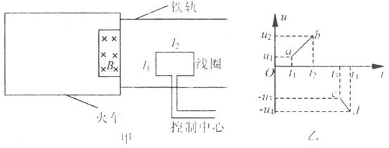 21.2006处7月1日,世界上海拔最高、线路最长的青藏铁路全线通车,青藏铁路安装的一种电磁装置可以向控制中心传输信号,以确定火车的位置和运动状态,基原理是将能产生匀强磁场的磁铁安装在火车首节车厢下面,如图甲所示(俯视图),当它经过安放在两铁轨间的线圈时,线圈便产生一个电信号传输给控制中心。线圈边长分别为