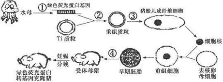 2008年诺贝尔化学奖授予了三位在研究绿色荧光蛋白(GFP)方面做出突出贡献的科学家。绿色荧光蛋白能在蓝光或紫外光的激发下发出荧光,这样借助GFP发出的荧光就可以跟踪蛋白质在细胞内部的移动情况,帮助推断蛋白质的功能。下图为我同首例绿色荧光蛋白(GFP)转基因克隆猪的培育过程示意图,据图回答: