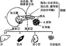 的相互关系。当血糖浓度降低时,激素①分泌量