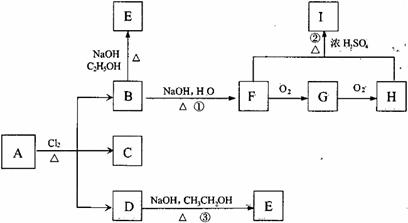 1体积带有支链的某烃A的蒸气完全燃烧后生成的CO2,比生成的水蒸气少1体积(在同温同压下测定)。0.1 mol该烃A完全燃烧的产物被碱石灰吸收,碱石灰的质量增加了39g。若烃A的一氯取代物只有3种,分别是B、C、D,且有如下的转化: