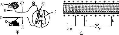 (4)乙图是甲图中①的一段,如果在电极a的左侧给一适当刺激,此时a-b之间会产生的膜外电流,其方向是_______;电流计c的指针会发生两次方向_________ (填”相同”或“相反”)的偏转。