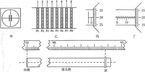 (1)用某种单色光做双缝干涉实验时,已知双缝间距离d=0.25mm,双缝到毛玻璃屏间距离L的大小由下图中毫米刻度尺读出(如戊图所示),实验时先移动测量头(如图甲所示)上的手轮,把分划线对准靠近最左边的一条明条纹(如图乙所示),并记下螺旋测微器的读数x1(如丙图所示),然后转动手轮,把分划线向右边移动,直到对准第7条明条纹并记下螺旋测微器读数x7(如丁图所示),由以上测量数据可求该单色光的波长。