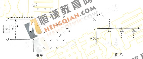 25.(18分)如图甲所示,建立Oxy坐标系,两平行极板P、Q垂直于y轴且关于x轴对称,极板长度和板间距均为l,第一四象限有磁场,方向垂直于Oxy平面向里。位于极板左侧的粒子源沿x轴间右连接发射质量为m、电量为+q、速度相同、重力不计的带电粒子在0~3t时间内两板间加上如图乙所示的电压(不考虑极边缘的影响)。