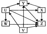 图示由5个物种(U、V、W、X、Y)组成的一个生态系统的食物网,Z表示分解者,箭头表示能量流动的方向。下列叙述正确的是[ ]