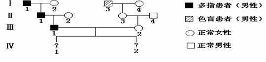 ⑶如果Ⅳ-1是一个男孩,此男孩既是多指又是色盲的概率为 ,只患多指不患色盲的概率为 ;