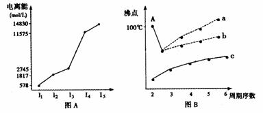 图B是研究部分元素的氢化物的沸点变化规律的图像,折线c可以表达出第 族元素氢化物的沸点的变化规律。不同同学对某主族元素氢化物的沸点的变化趋势画出了两条折线--折线a和折线b,你认为正确的是a还是b?并说出理由: 。