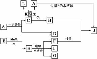 A-L为中学化学已学过的物质,相互间有如下转化关系(部分产物如H2O已略去)。其中C、D、G、I均为短周期元素形成的单质,D、G、I为常见气态单质;D的原子最外层电子数是次外层电子数的3倍;C、G的元素同周期,且原子最外层电子数相差4,它们的简单离子电子层结构不同;K为红棕色固体粉末。