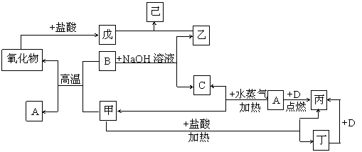 (14分)A.B.C.D是四种常见的单质,A.B均为金属;C.D常温下均是气体。甲.乙.丙.丁.戊.己为六种常见的化合物。它们之间有如图所示的转化关系: