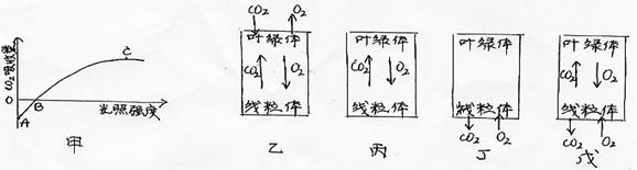 (1)该植物叶肉细胞处于丁图状态时,对应图甲曲线中 点,当叶肉细胞处于甲图中B-C段(不含B点)状态时,指出乙至戊图中对应的是 图。