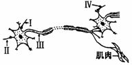 分别刺激右图中的I、Ⅱ、Ⅲ、Ⅳ处,不能引起肌肉收缩的是( )