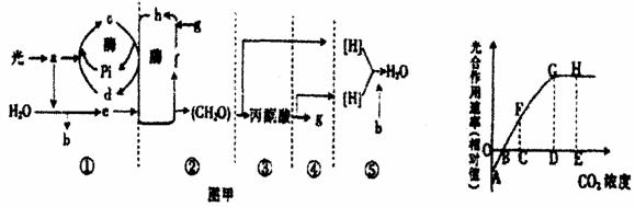 29.(14分)在光照条件下,小麦叶肉细胞内发生了生理过程①-⑤,如图甲所示(图甲中a-b为物质名称)。CO2浓度对植物光合作用速率的影响,如图乙所示。请回答: