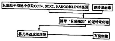 2007年,科学家研制出可以分化为多种细胞的“万能细胞“。其诞生过程如下图,图中OCT4、SOX2、NANOG和LIN28是胚胎干细胞中能高度表达并决定其全能性的四个基因,将”万能细胞“值入小鼠身体,值入的细胞长成了“肿瘤”,“肿瘤”中出现了神经、骨骼、肌肉等多种类型的细胞。