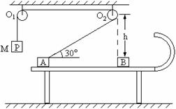 。滑轮O2的正下方桌面上放一与A相同的物块B,滑轮距桌面高为h。开始时用手托住P,使P、A均静止,细绳处于伸直状态。现放手让P下落,A向右运动,设A运动过程中始终没有离开桌面。问: