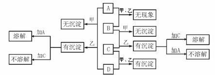 A、B、C、D分别代表硝酸银、偏铝酸钠、稀盐酸、浓氨水四种无色溶液中的一种。甲、乙两同学按不同体积比进行了两两混合,实验现象如下: