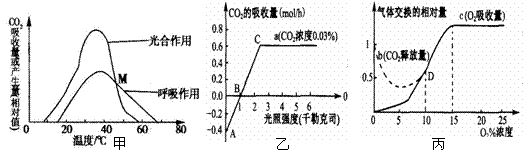 (1)甲图中M点表示的生物学含义是 ,在40℃-60℃范围内,随着温度上升,呼吸作用和光合作用的变化速率不同,其主要原因是 。