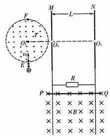 24.(22分)如图所示,半径为r、圆心为O1的虚线所围的圆形区域内存在垂直纸面向外的匀强磁场,在磁场右侧有一竖直放置的平行金属板M和N,两板间距离为L,在MN板中央各有一个小孔O2、O3、O1、O2、O3在同一水平直线上,与平行金属板相接的是两条竖直放置间距为L的足够长的光滑金属导轨,导体棒PQ与导轨接触良好,与阻值为R的电阻形成闭合回路(导轨与导体棒的电阻不计),该回路处在磁感应强度大小为B,方向垂直纸面向里的匀强磁场中,整个装置处在真空室中,有一束电荷量为+q、质量为m的粒子流(重力不计),以速率v0从圆形磁场边界上的最低点E沿半径方向射入圆形磁场区域,最后从小孔O3射出。现释放导体棒PQ,其下滑h后开始匀速运动,此后粒子恰好不能从O3射出,而从圆形磁场的最高点F射出。求: